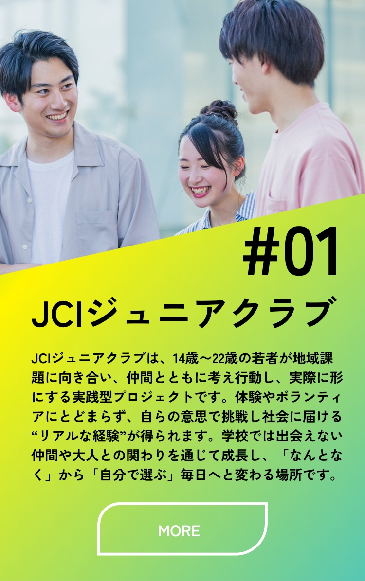 JCIジュニアクラブは、14歳〜22歳の若者が地域課題に向き合い、仲間とともに考え行動し、実際に形にする実践型プロジェクトです。体験やボランティアにとどまらず、自らの意思で挑戦し社会に届ける“リアルな経験”が得られます。学校では出会えない仲間や大人との関わりを通じて成長し、「なんとなく」から「自分で選ぶ」毎日へと変わる場所です。
